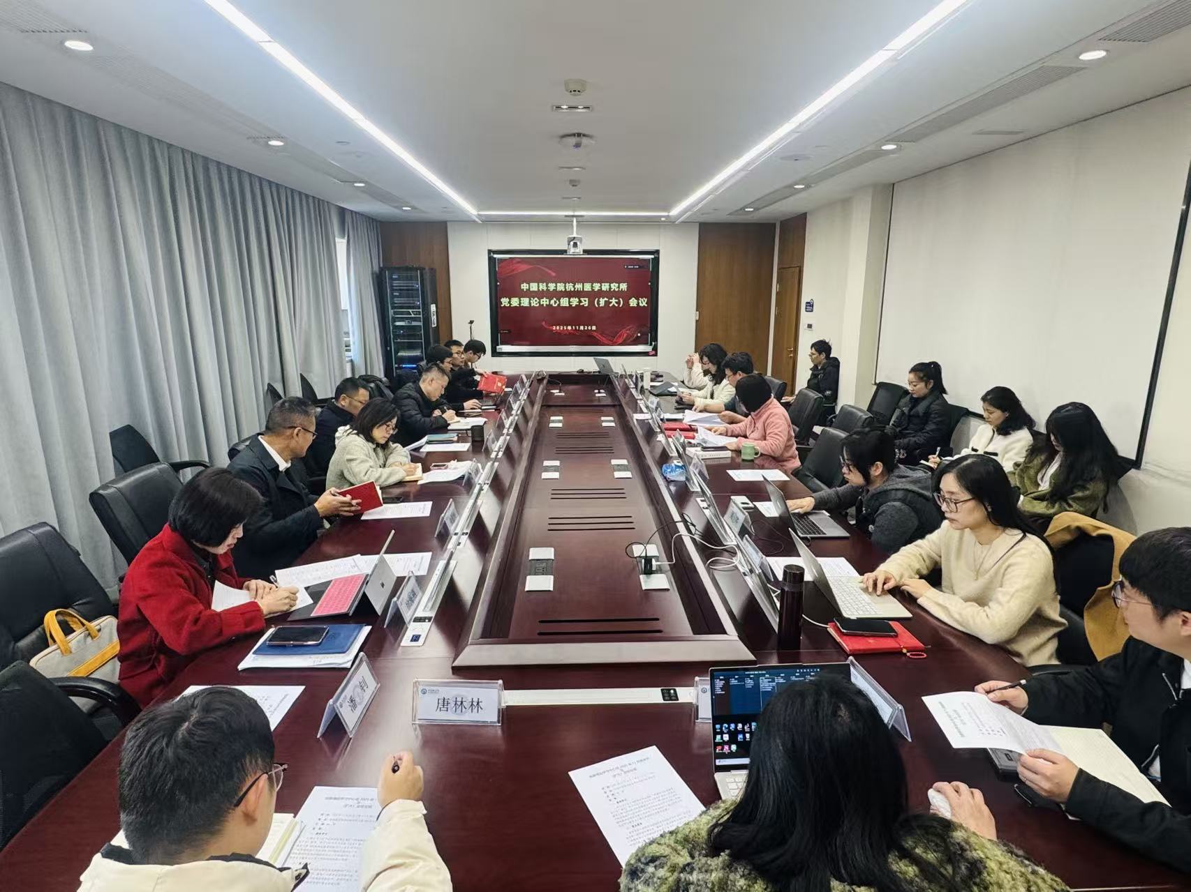2025年11月26日,中國科學院杭州醫學研究所理論學習中心組召開學習(擴大)會,學習習近平總書記關于“因地制宜發展新質生產力”的重要論述精神并開展專題研討;學習《中國共產黨思想政治工作條例》和《中國科學院院屬單位信息公開公示工作管理辦法》,按照黨中央和院黨組要求部署,研討宣貫落實舉措。黨委書記、副所長高軍專題領學《習近平談治國理政》第五卷及習近平總書記在《求是》雜志上發表的重要文章《因地制宜發展新質生產力》,黨委委員葉斌圍繞主題,就扎實推進新一輪院省共建合作進行重點發言匯報,與會人員圍繞“因地制宜發展新質生產力”開展交流研討。黨支部書記、核酸分子醫學研究中心負責人、創新研究院首席科學家吳芩表示,總書記關于“瞄準世界科技前沿,在加強基礎研究,提高原始創新能力上持續用力,在突破關鍵核心技術前沿技術上抓緊攻關”的重要論述,為醫學所正在開展的核酸藥物、診斷、腫瘤分子分型等臨床問題驅動的前沿關鍵核心技術攻關指明了目標方向;同時,目前創新研究院正處于建立并優化管理體制機制的重要階段,總書記關于“治理體系和治理能力的現代化”的論述為研究所改革科研組織方式提供了理論和實踐依據。與會人員結合工作實際,就深學細悟《中國共產黨思想政治工作條例》及進一步加強研究所信息公開公示工作談體會、凝共識,并圍繞將思政工作融入重大任務攻關、人才隊伍建設、研究生培養教育和新建所創新生態建設的全過程進行了研討交流。大家一致表示,要以思想政治工作強基固本,以高水平科技自立自強為目標,發揮國家戰略科技力量主力軍作用,為搶占醫學科技制高點、因地制宜發展新質生產力作出貢獻。高軍在總結時指出,一是要提高政治站位,分層分類強化學習,組織全所黨員干部、科研人員、管理骨干及研究生,深刻領會習近平總書記關于思政工作的重要指示批示精神及關于因地制宜發展新質生產力的重要論述,切實增強貫徹落實的政治自覺、思想自覺和行動自覺。二是要聚焦主責引領創新,將學習成果轉化為推動研究所高質量發展的系統思路和務實舉措,以高質量黨建激發創新活力、引領科研方向、保障科研攻關,不斷強化國家戰略科技力量的使命擔當。三是要健全體系壓實責任,推動思想政治和意識形態工作與科研、管理深度融合,確保黨對科技事業的全面領導落到實處,為搶占科技制高點提供堅強政治保障。杭州醫學所黨委理論中心組成員、黨支部書記、行政部門負責人參加會議,青年理論學習小組負責人和支部兼職輔導員列席學習研討。黨委書記、副所長高軍主持會議。會議現場
